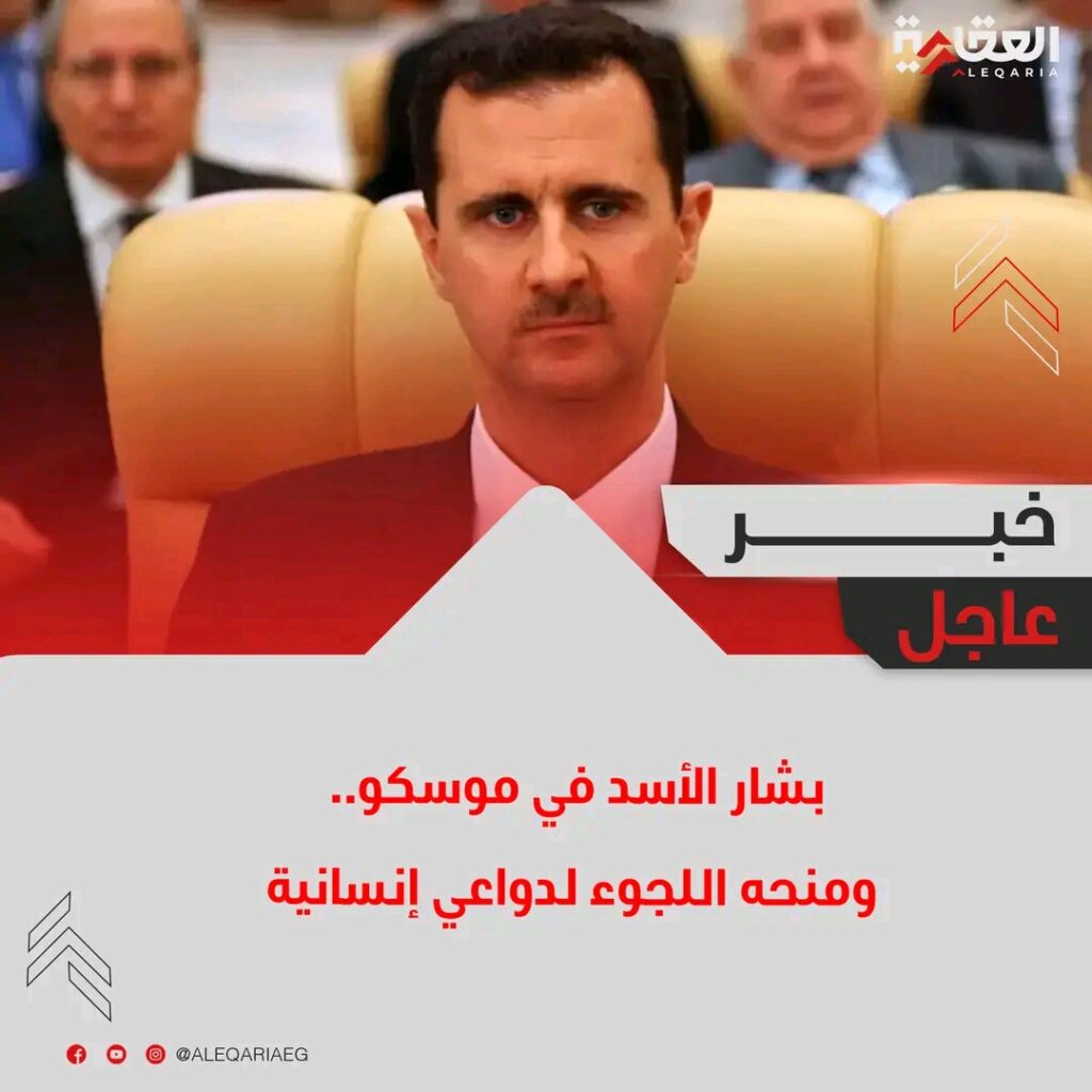 أعلنت القناة الروسية الأولى أن الرئيس السوري بشار الأسد قد وصل إلى موسكو. وفي خطوة مفاجئة، كشف الكرملين عن تقديم اللجوء الإنساني للأسد وعائلته. - مصر الحرةالتجاوز إلى المحتوى